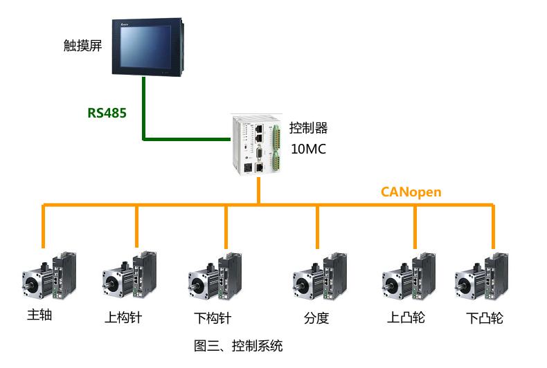 10MC運(yùn)動控制器的COM2口與DVP-B10S411觸摸屏通過RS485通訊,通過觸摸屏可以設(shè)置用戶工藝參數(shù);控制器的CAN端口與A2伺服進(jìn)行CANopen通訊,通過CAN總線控制伺服的運(yùn)動、讀取伺服的狀態(tài)。