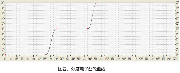 設(shè)備通過分度伺服跟隨主軸執(zhí)行預(yù)先設(shè)定的電子凸輪數(shù)據(jù),從而達(dá)到對定子的分度控制。分度電子凸輪曲線如圖四所示。