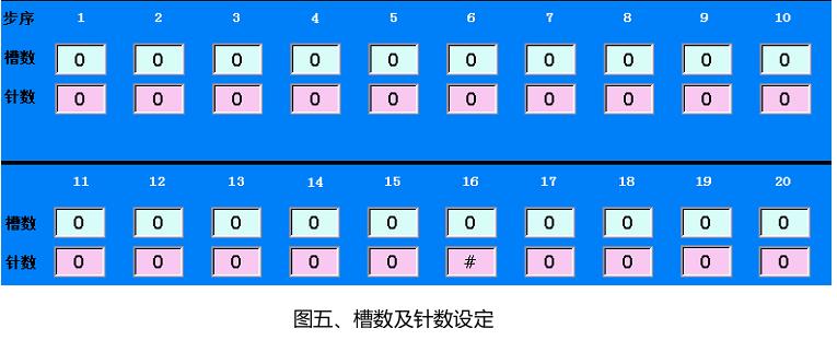 用戶可以通過HMI一鍵生成“逐槽綁”數(shù)據(jù),也可以自行設(shè)定綁扎槽位順序,自定義每一槽針數(shù),還可以設(shè)定定子分度方向,從而實(shí)現(xiàn)逐槽綁、花式綁、正綁、反綁。設(shè)定界面如圖五所示。