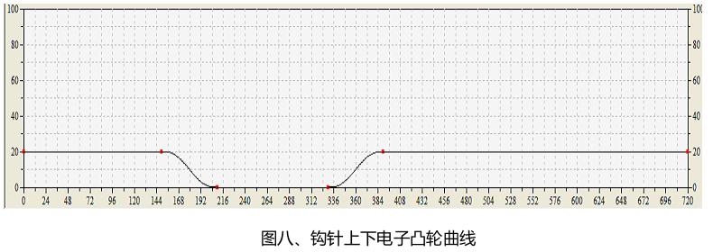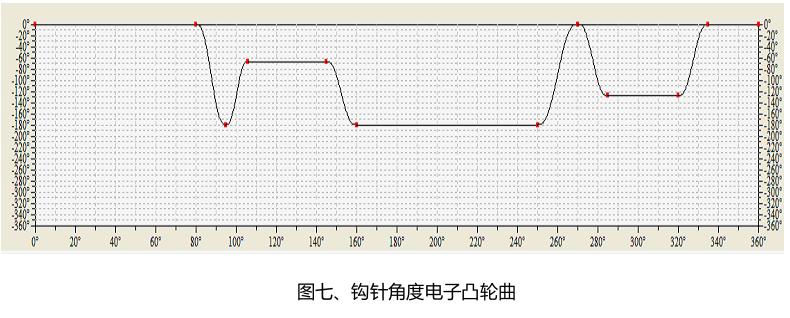 首先構(gòu)建好凸輪曲線,使用“MC_CamTableSelect”指令選擇對應(yīng)的凸輪曲線;再通過“MC_Camin”指令使得主軸與從軸按照選定的凸輪曲線嚙合(如圖六所示)。構(gòu)建完成的鉤針角度電子凸輪曲線如圖七所示,構(gòu)建完成的鉤針上下電子凸輪曲線如圖八所示,