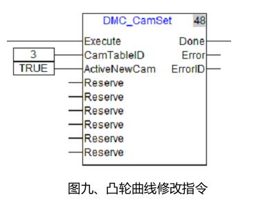 在實(shí)際使用中,因客戶產(chǎn)品的多樣性,不同的馬達(dá)定子,客戶需要隨時修改電子凸輪曲線,通過10MC運(yùn)動控制器的“DMC_CamSet”指令可以在線實(shí)時修改電子凸輪曲線,提高了設(shè)備的通用性。凸輪曲線修改指令如圖九所示,在線修改凸輪曲線界面如圖十所示。