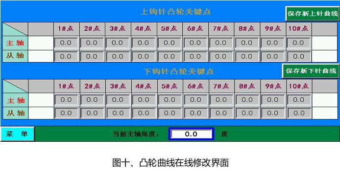 10MC總線運(yùn)動控制器控制主軸運(yùn)行,主軸帶動機(jī)械凸輪控制鉤針的前后運(yùn)動,同時主軸又作為鉤針、上下電子凸輪的主軸信號,控制鉤針?biāo)欧⑸舷峦馆喫欧鶕?jù)預(yù)設(shè)的凸輪數(shù)據(jù)運(yùn)動。