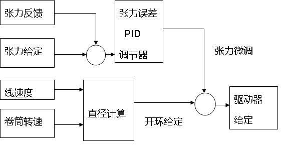 由于采用以上技術(shù)方案,使得排線平整,進(jìn)而使收線伺服的控制是典型的中心卷繞控制。中心卷繞控制原理框圖如圖3所示。根據(jù)收線伺服當(dāng)前實際轉(zhuǎn)速計算需要的開環(huán)給定量,同時通過跳舞輪反饋引入張力調(diào)節(jié),最終確定收線伺服驅(qū)動器的給定量。