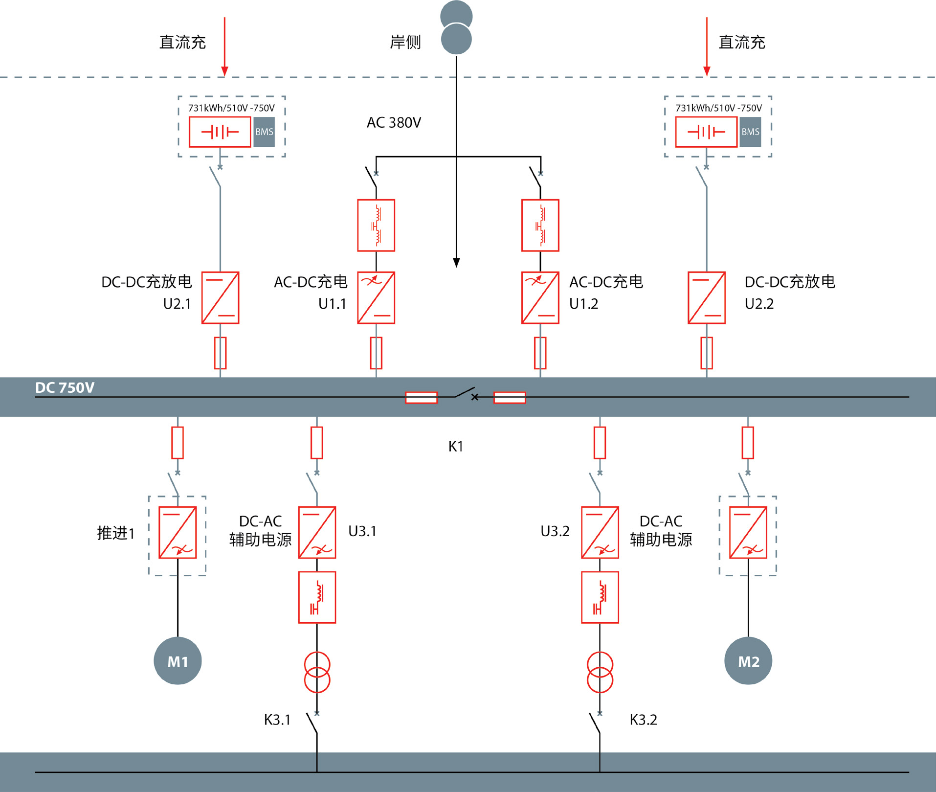 針對該電動船使用航線特點,提供交流充電樁滿足其充電靈活性,丹佛斯AFE產品采用四象限整流技術,可為電池靈活提供相應的直流充電電壓,并且可將對岸上電網的污染降低至最小。
